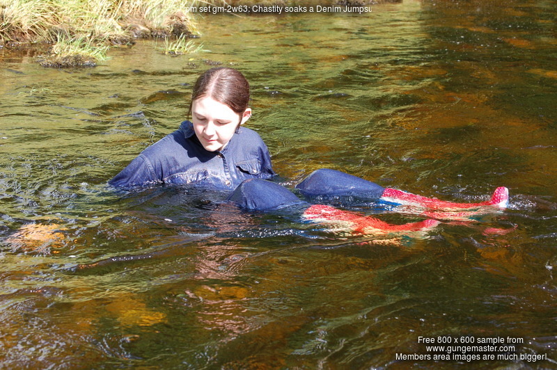 Dressed in blue denims, dark t-shirt, and lace-up black plimsolls, Chastity first takes a lemonade shower on the riverbank at the hands of Maude, and then, soaked to the skin in fizz, she plunges into the river for a fully clothed swim, denim jacket and all!