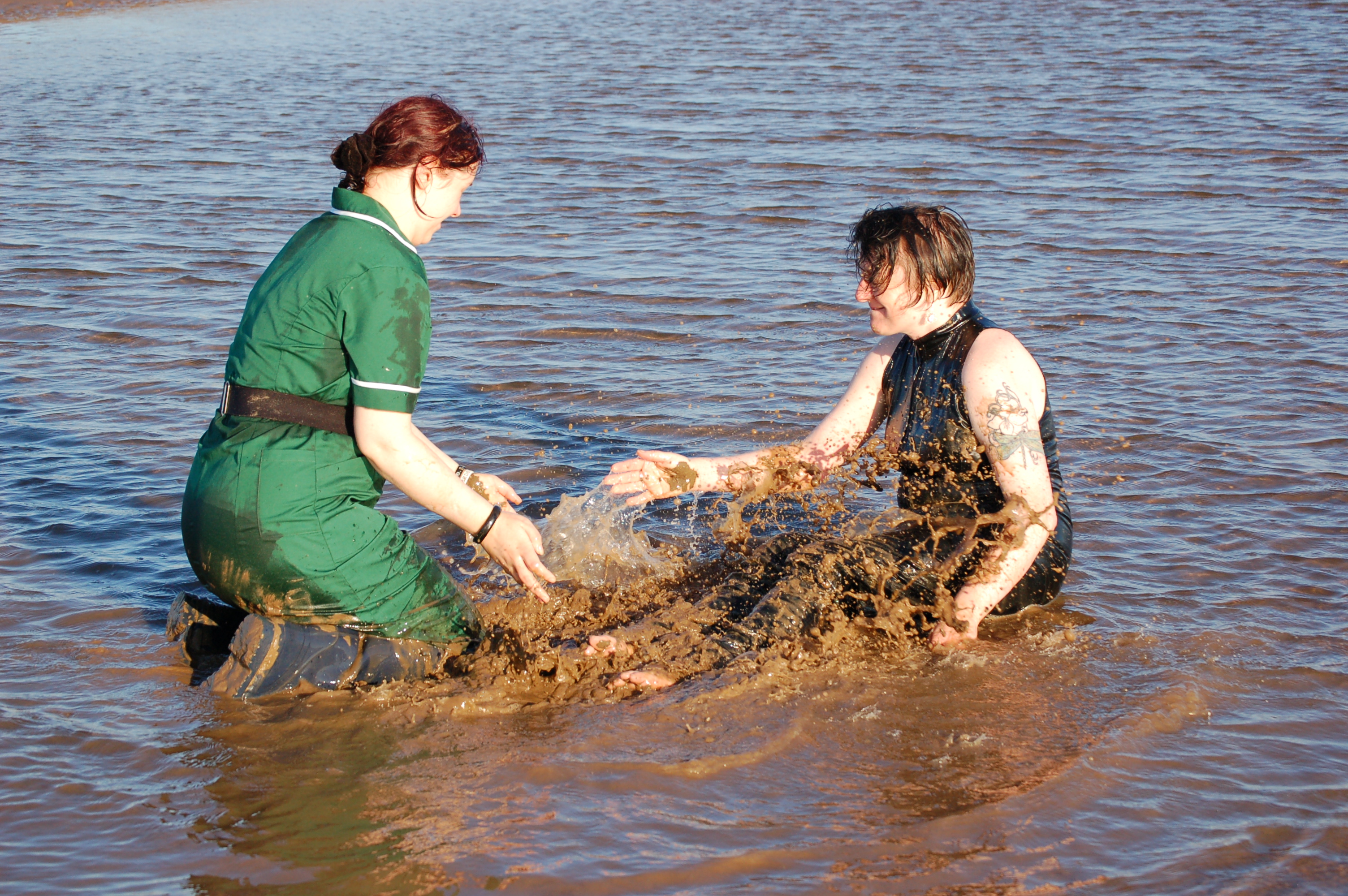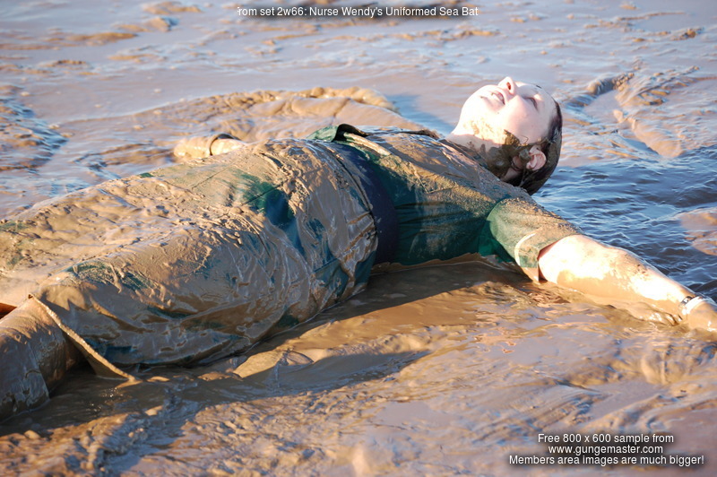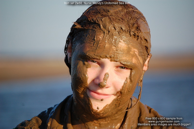 Wendy, wearing one of her uniform dresses over an already wet swimsuit from a previous dip in the water, first plays in the shallows with Evelyne, they sit in the water and splash each other, and then throw liquid mud at each other, with Wendy enthusiactically covering herself completely in the sandy mud, inclduing her hair.