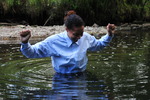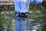 She wades into the river slowly, taking time to flood her blue wellington boots one at a time, then, with both boots filled and the river lapping at the legs of her coverall, she bends one knee, soaking her right leg to mid-thigh, and splashes water up onto her suit. She stands up, boot-tops just under the water, and goes on splashing herself until the front of the legs and trunk of her coverall are soaked.