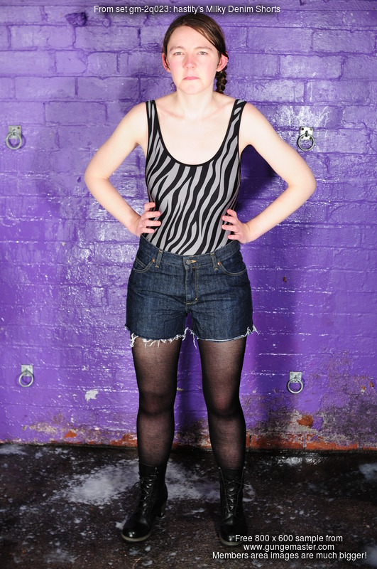 Milk pouring comes first. We start with the front of Chastity's shorts, a full litre of milk is poured in while the video camera shoots close up shots of her shorts and we can watch as the milk first flows out at her legs and runs down her tights, and then as more and more of it starts to soak through the denim from within, just a little at first but steadily soaking more and more of the material till the front of her shorts are entirely drenched in milk.