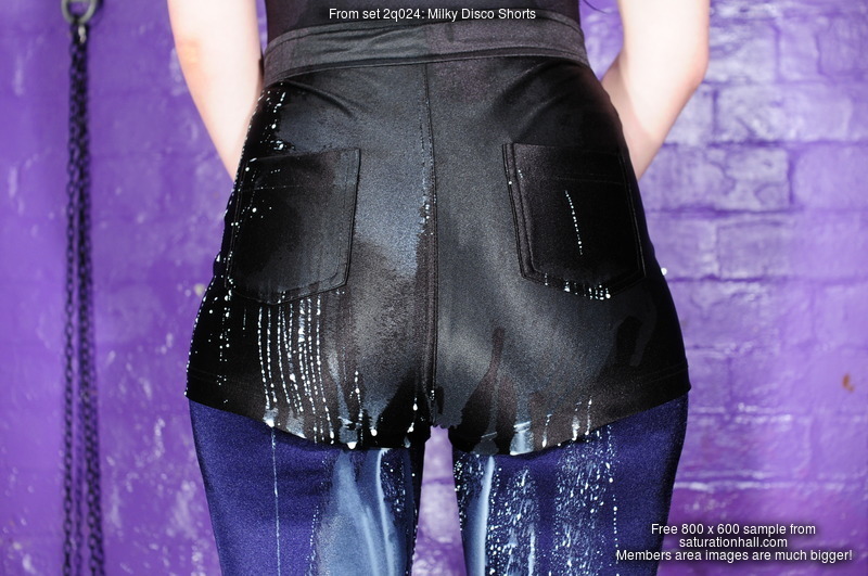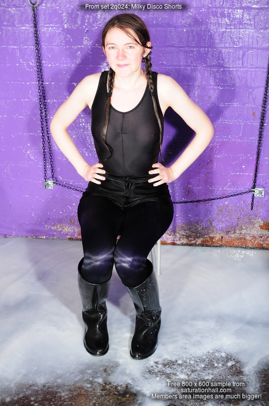 Chastity wears a charcoal dance leotard, blue shiny leggings, with a pair of black disco shorts over them, and black shiny wellies. First, she has milk poured into her leotard, from where it floods out over and through her shorts and down her leggings. Then she has her shorts filled, font and back.