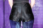 Chastity turns round and the back of her shorts gets the same treatment, with the same results, first milk flows down her hose, but as more is poured in it soaks through the shorts from within. Again the scene is filmed close-up on the shorts so we can admire the lovely shape of her bottom as more and more milk soakd through her shorts.