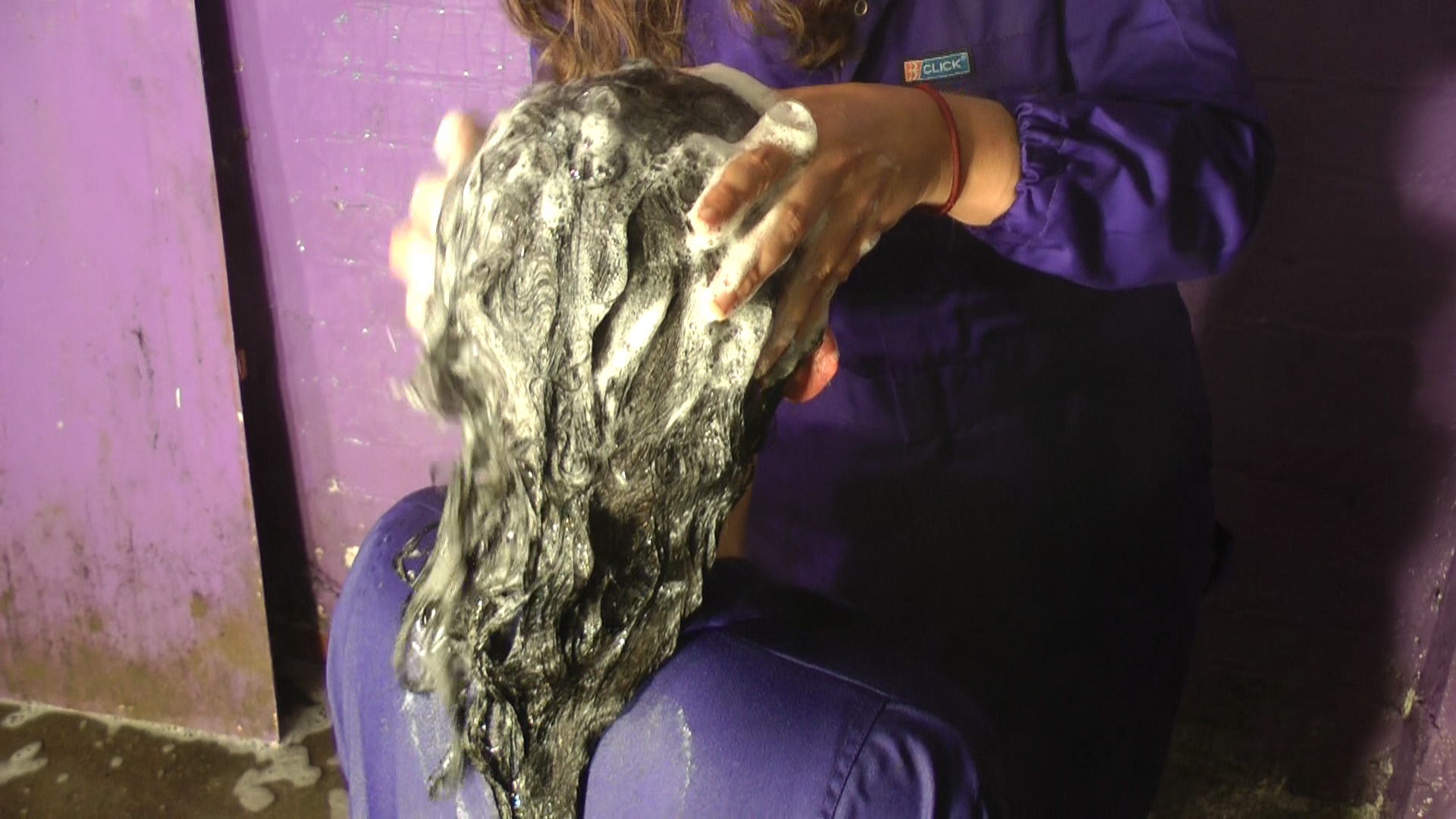 Both girls end up completely soaked, and during the scene they thoroughly lather each other up, both their suits, and their long hair, with lots and lots of shampoo.