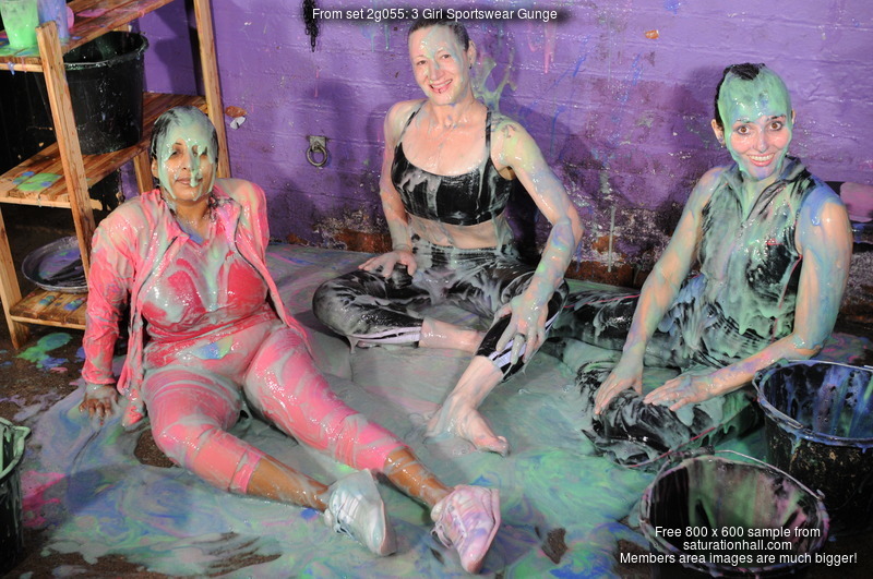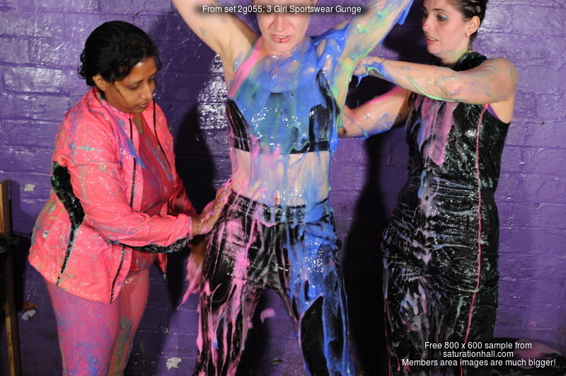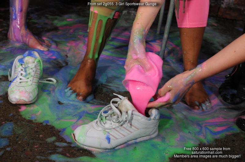 What follows involves clothes filling, sitting in trays of goo, pouring gunge all over each other, standing in buckets of goo and being covered, shoe-filling, and finally pouring buckets of gunge over their heads. All three girls are reduced to technicolour gunge-drenched messes. Gunge colours used are blue, green, and pink, and they have lots and lots of it to play with!