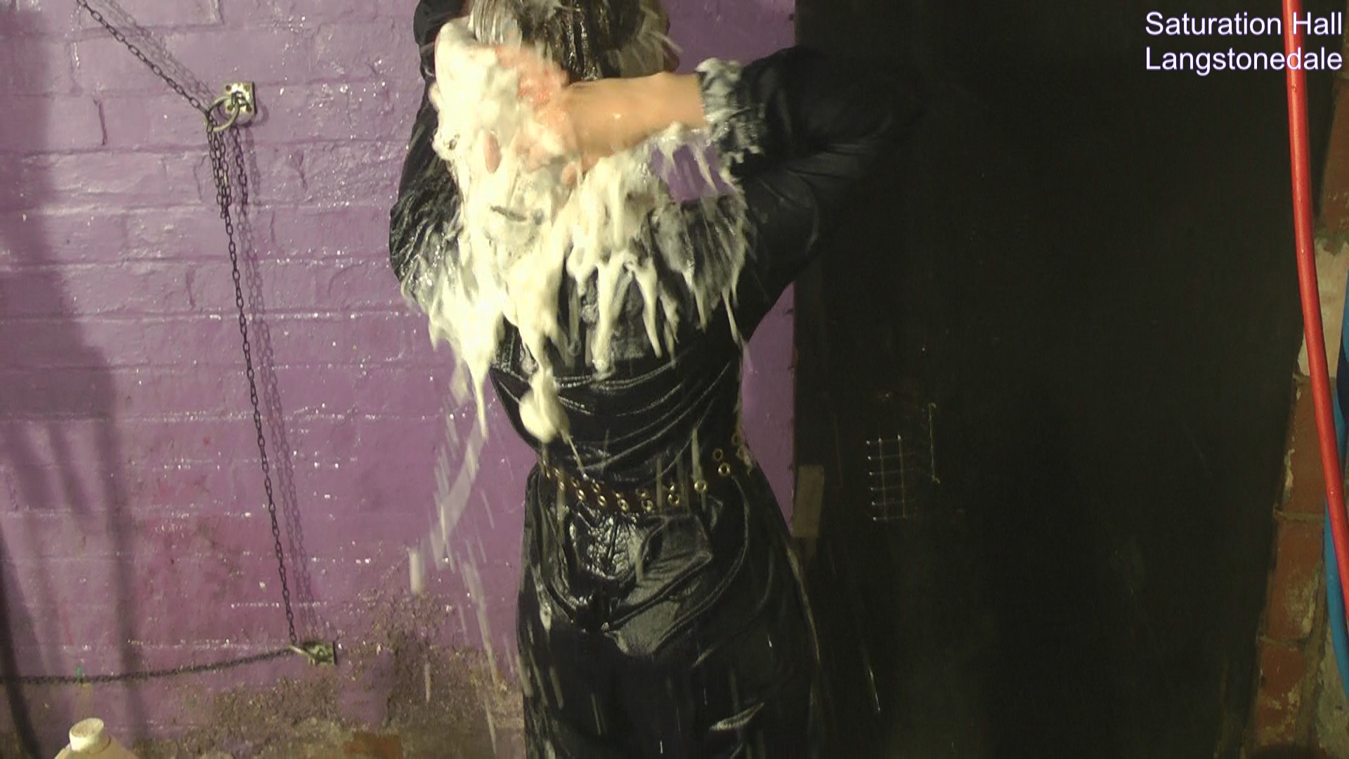Rosemary, in a black boilersuit, and Maude, in tight black running trousers and jacket, hose each other down and wash each other's hair in the dungeon. They are wearing the somewhat damp clothes they travelled back from a mud scene in, beneath which they are wearing the same underclothes they wore in the mud. They thoroughly hose each other down, and then wash each other's hair, all while still in their now soaking wet clothes.