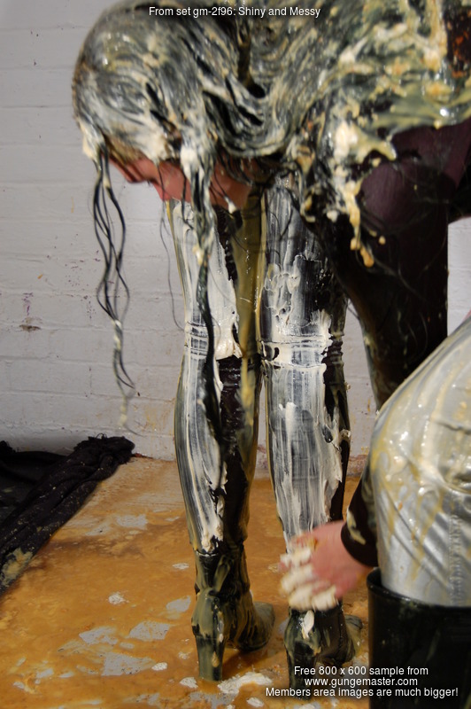 Chastity, dressed in sliver PVC jeans, shiny fabric jacket, and wellies, and Lady Amaranth of the Southlands, dressed in a black PVC mini-dress over black spandex leggings and black boots, take turns to gradually cover each other in syrup and custard, with the recipient being completely unresisting when it's her turn to be gunged.