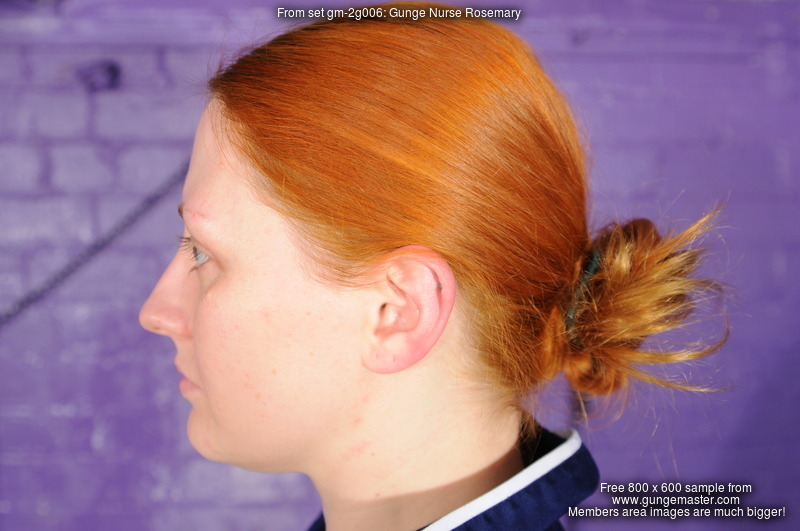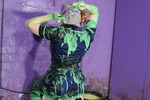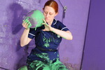 Dressed in a smart dark blue modern veterinary nurses uniform, with green wellies on her feed, redhead Rosemary gives herself a very thorough green gunging, utterly drenching her uniform and herself in goo.