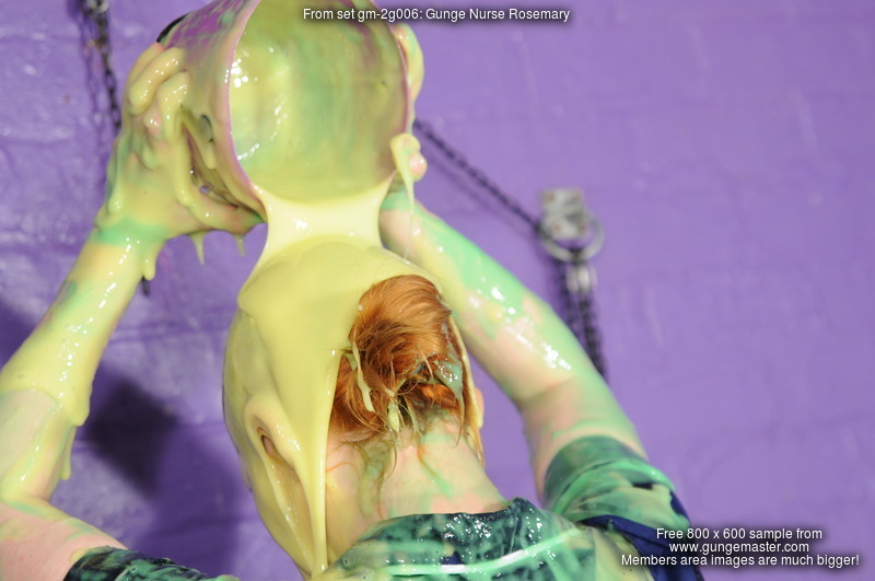 There's gunge-sitting, suit filling, pockets filling, slathering bright gunge all over each other, and of course full head and hair gunge shampooing too. By the end of the scene our two exercise girls are reduced to green gloopy messy misses, drendhed from head to to in gunge.