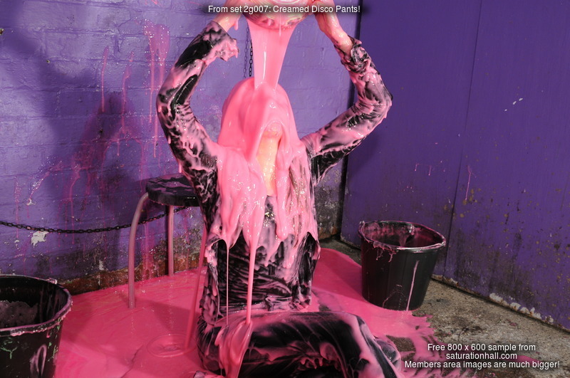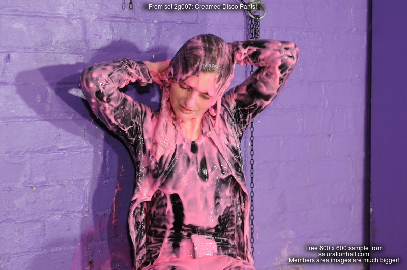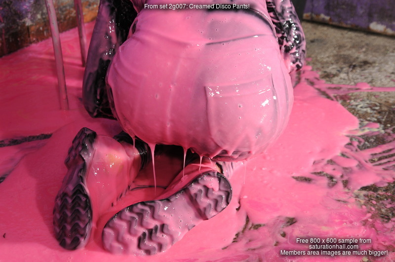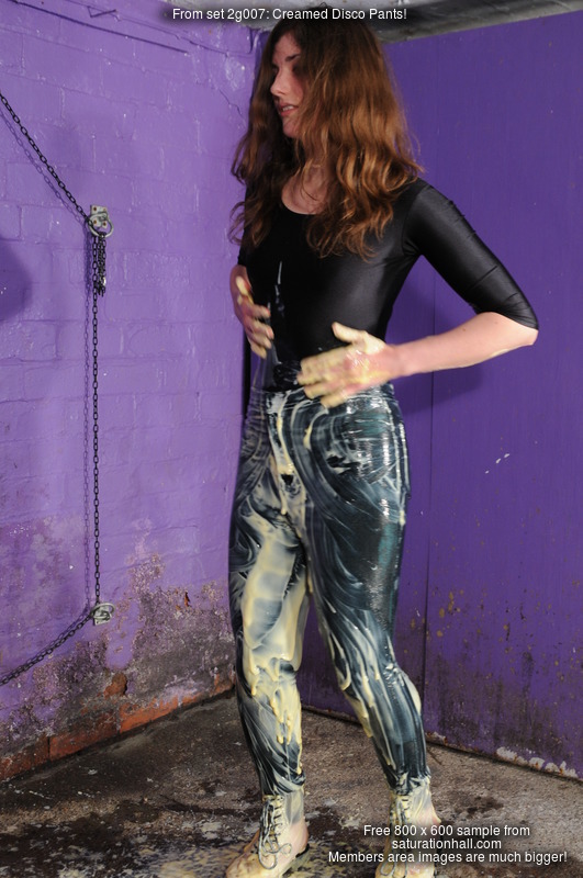 Cream first, or to be accurate Devon Dream, carefully poured in to fill her disco pants, first down the front and then down the back too. The creamy fluid flows down inside the pants and soon leaks through to the outside, especially down her legs, and then at her bottom as she fills the back. Custard soon joins the cream, full cartons poured in front and back. She jigs and dances in her well-filled trousers, reveling in sensation as the thick creamy liquids flows down inside and out.