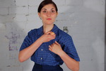 Eggs come first, neatly dropped into the pocket of her shirt, and then placed, whole, into the pockets of her skirt, where she then breaks them from outside, releasing a tide of yolk and white inside her pristine outfit, which doesn't stay pristine for long. More eggs go down inside the front of her shirt, to collect and slosh about at her waistbans, before a final couple of eggs go over her head for luck.