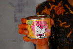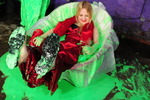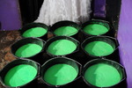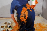 She fills a tray and sits in it, pours gunge all over her ouitfit, fills her pockets, and pours lots of gunge all over her hair and face to finish with.