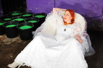 Rosemary lies back in the dungeon's tin bath, relaxing for a moment, when Felicity strikes, a full bucket of thick green gunge dumped straight into Rosemary's middle, drenching the beautiful wedding dress in a tide of green all over her front and down between her legs, pressing the skirt of the dress down as it flows. For just a moment Rosemary is outraged, but then she starts to feel the lovely wetness of the gunge coming through her dress, and just gives herself to the moment, enjoying the sensations as Felicity brings another bucket and continues the green slime destruction of Rosemary's dress.