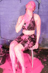 Her bra-top gets the treatment next, and it too is drenched in gunge. Her bare feet get the full treatment, and then it's the turn of her long red hair to be completely drenched in pink goo, and she pours it all over her face too. By the end of the routine she is utterly drenched in gunge from head to toe.