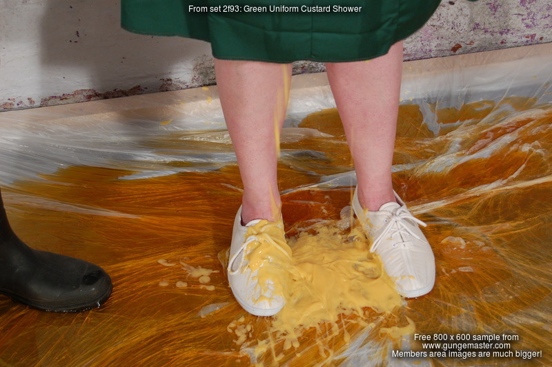 This set also includes Chastity removing her skirt again, walking on it in the pool of gunge on the floor, then putting it back on, and her hat being taken off her, gunged, and put back on several times, plus having her hair and pigtails thoroughly shampooed with both syrup and custard. And once she's been totally and completely gunged, we also get to see the hose-down, delivered by Maude.