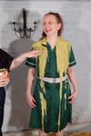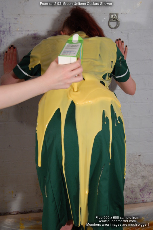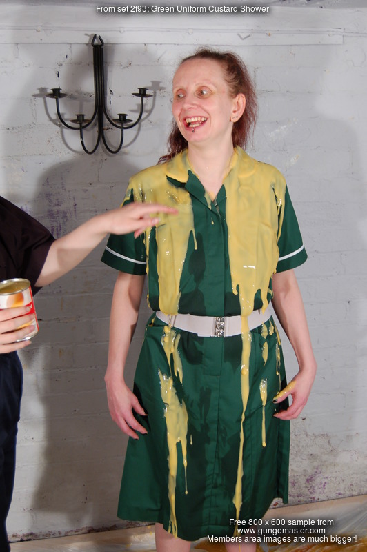 Watch Lady Amaranth of the Southlands, dressed in a bottle green nurses uniform dress, white elestic nurses belt, and white deck shoes, having her dress well filled and then completely covered in custard, all at Chastity's hands.
