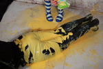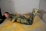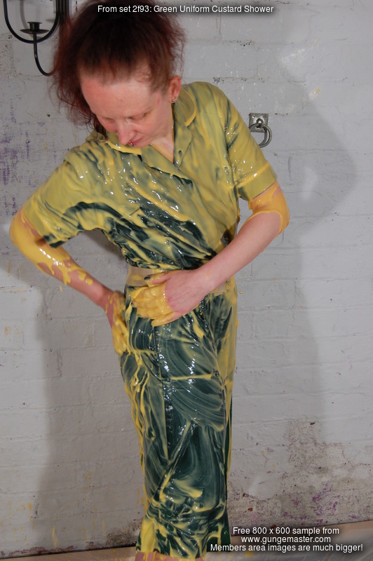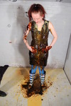 She likes custard too, and soon fills one of her back pockets with thick yellow gunge. And then she sets about herself with treacle and syrup, and very quickly her once-clean suit is drenched as she pours more and more gunge down her front while sitting on the dungeon stool, allowing the mixed mess to flow down over her legs and trunk.