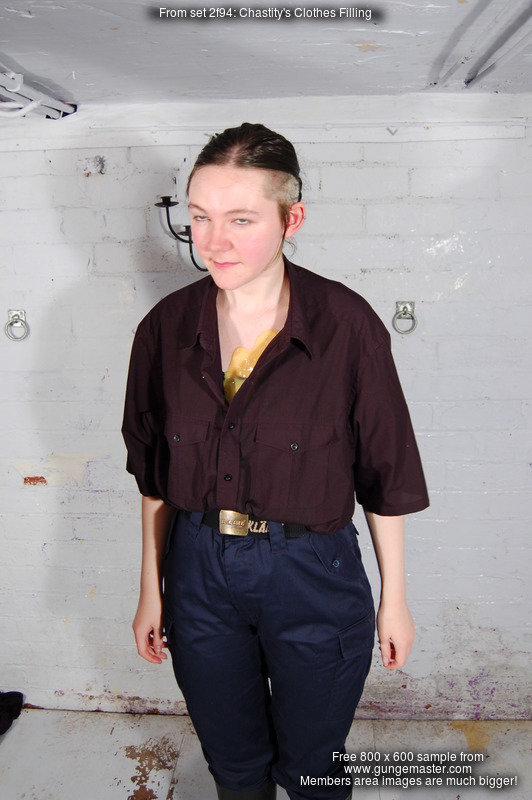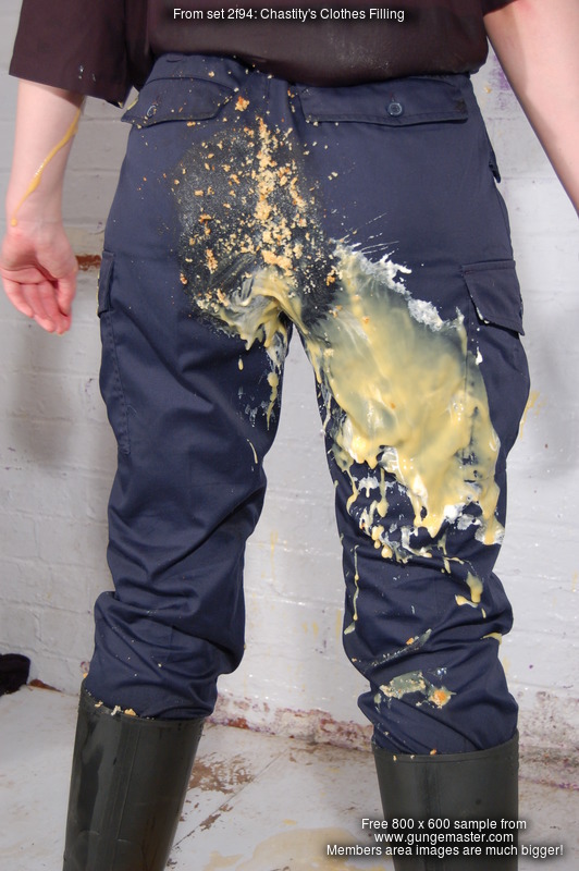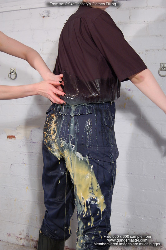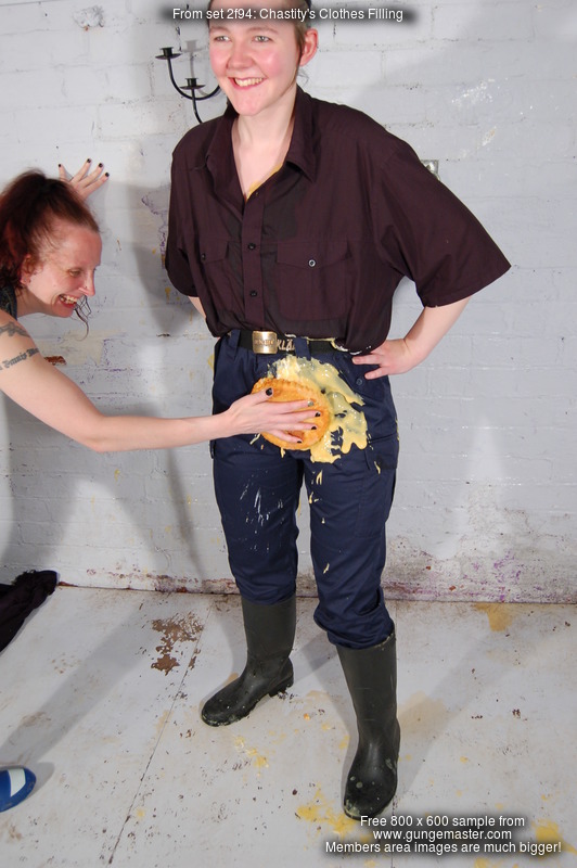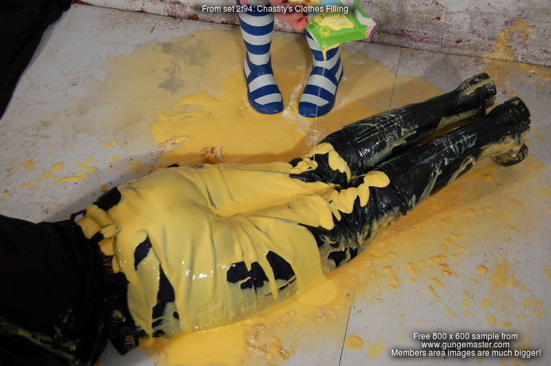 Dressed in dark blue combats, black wellies, and a baggy black short-sleeved shirt, Chastity has her entire outfit comprehensively filled and then covered in goo, at the hands of Lady A.