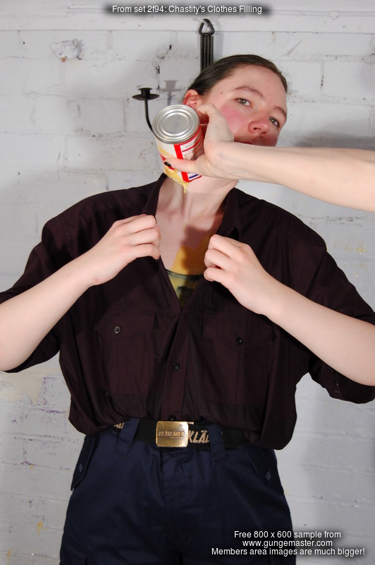Now that Chastity is sitting comfortably, enjoying the mashed mess under her bottom, Lady A sets about the outside of Chastity's outfit, starting with custard poured all over her shirt, from where it floods down to drench the trunk of her trousers completely.