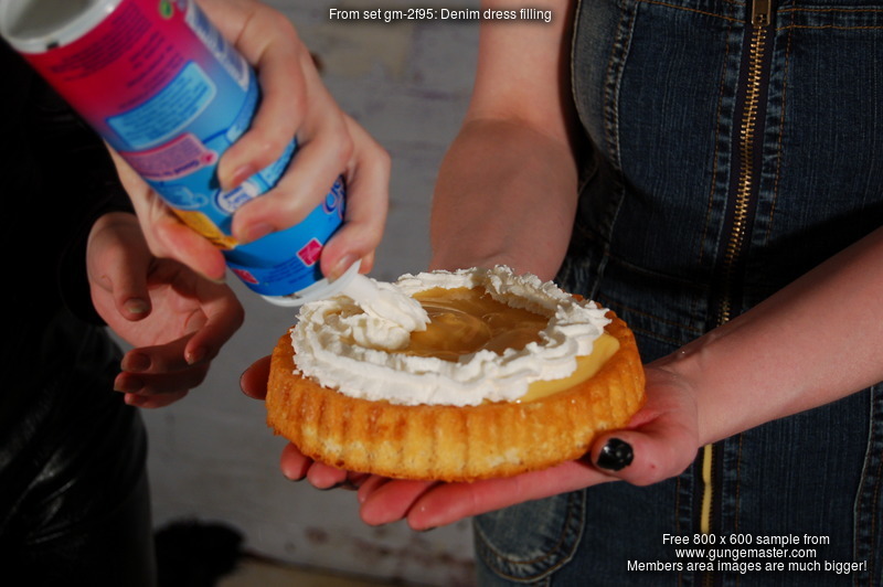 Her ladyship helpfully holds out her hands, to allow Chastity to make up a nice flan with custard and squirty cream, which Chastity then delivers with some force splat! onto the front of Lady-A's dress. That's better, now she has cream, custard, and mashed flan base nicely splattered over the denim. And remember that nice tempting denim-clad bottom Lady-A showed off earlier? Two pies, one after the other, splattered on and mashed in.