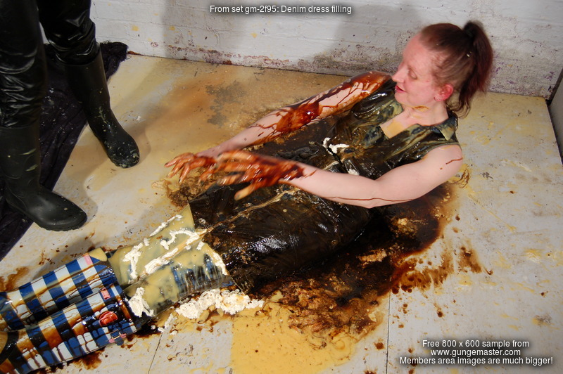 And now of course, with pie mess on the front and back of her dress, there's nothing for it for Lady-A other than to have herself completely gunged. Custard first, poured over her shoulders and all down the front of her dress, and once it's all poured on, carefully spread over any remaining clean areas till the front of her dress is completely covered and soaked. Then she turns round, and braces herself leaning forward, emphasising her pie-splatered bottom and otherwise completely dry back. Chastity takes an unusual approach, starting with a large bottle of cola followed by one of lemonade, pouring them straight onto the dry denim of Lady-A's dress, the fizzy liquid foaming and fizzing as it flows down. completely drencing the back of the dress and wetting the seat of her ladyship's spande leggings beneath, and then Chastity starts to pour black treacle all over the now soaked denim dress. She pours several cans on, starting at her ladyship's neck, and working down so that a tide of slow-flowing treacle engulfs Lady-A's entire denim-clad back, flowing in a beautiful wave of liquid black over her wet and pie-splattered bottom and down the back of the skirt of the dress.