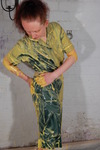 She's well filled at the front and soaked and covered at the back, but is Lady-A's gunging complete? Only one way to check, as she quite willingly sits, them lies down, in the pool of spillages on the floor, and unzips her dress from the bottom, opening it out to reveal her messy, but not yet totally covered, spandex leggings beneath the dress. Grabbing more custard, Chastity sees to it that the leggings suffer properly, pouring cans of custard up and down both legs and all across her ladyship's trunk, from where it flows down into her crotch, down between her legs, and onto the inside of the back of her dress on the floor beneath her.