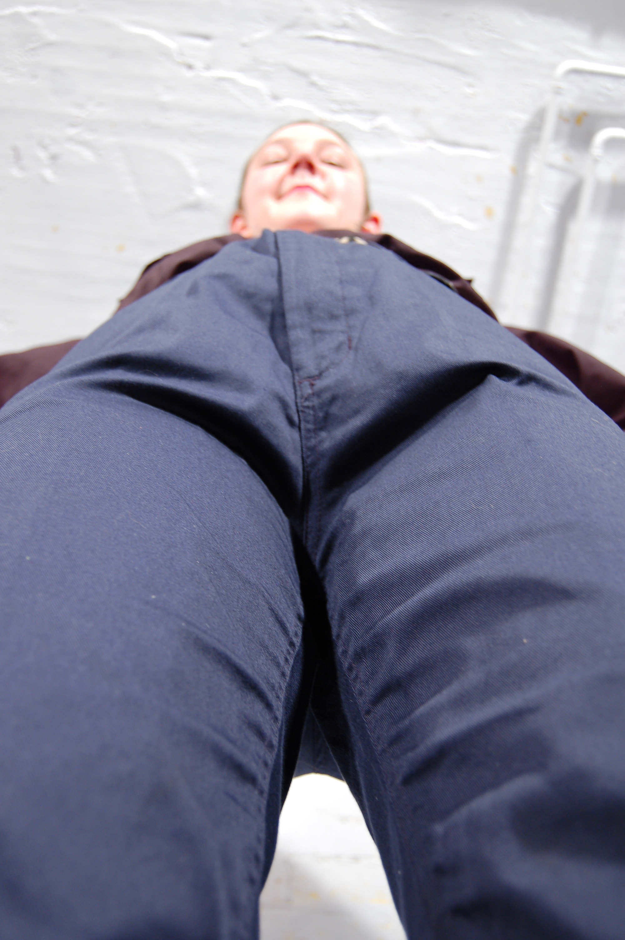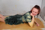 The gunging continues, as she steadily reduces herself to a wet and sticky mess, before she takes to the gunge-covered floor and writhes about in the pool of mixed milk, custard, treacle and syrup. She makes gunge angels on the floor, rolls onto her front, pressing her already drenched suit down into the gunge, and then rolls onto her back again, and relaxes, utterly drenched in mess.