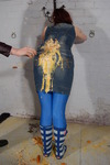 First we get to admire Lady-A's outfit, all nice and clean and dry, beautifully fitting her slender frame. How beautifully the tight dress fits her shapely bottom, what an inviting target - more on this later. Her gunging begins with dress filling, cans of custard carefully poured in down the front, flowing over her swimsuit just visible at the front, and working its way down inside, to drip from the front hem down her legs and onto her boots. Once a few cans have been poured in she is quite enjoying the sensations as the upper part of her swimsuit is nicely soggy under the filled dress, and the wetness of the custard is starting to seep through her leggings too, however from the outside, other than some leakage at the zip, her dress still looks clean and dry. Time to fix that with some custard pies!