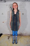 She dresses in a simple artist style, wearing a pinstriped grey and dark blue artists smock, belted at the waist with an elastic nurses belt in dark blue, over shiny black leggings and lace-up black plimsolls, and using the dungeon as her studio, she sets about herself with enthusiasm.