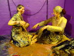 The ladies test each other's outfits very thoroughly indeed, Felicity has treacle poured into her trousers both front and back, till it drips from the leg-bottoms and pools on the floor at her feet, then she has her shirt filled, her back covered, and finally the entire outfit covered all over.