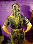 Next she starts to fill the waistcoat, she gets quite a lot inside before suddenly the contents start to leak out, flooding down her trouser-leg. More custard is poured in, and allowed to flood out, and then she does her sleeves - one is filled with custard, the other coated in treacle.