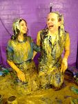 Once their clothes are pretty well covered, the ladies take turns to sandwich each other's heads with custard pies, and drench each other's lovely hair in custard, shampooing it in thoroughly.