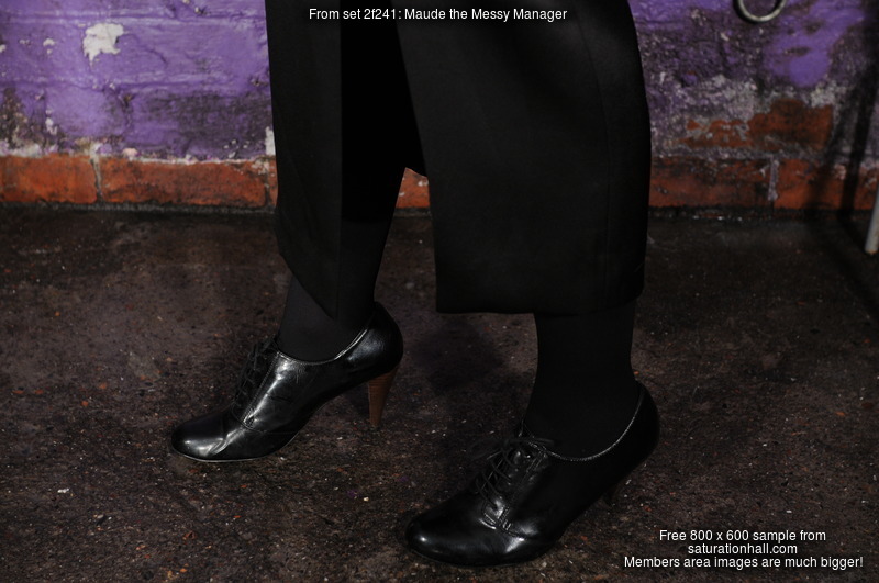 Today Maude is testing a potential new managers uniform. She is wearingt a floor length black pencil skirt, with a split to the knee on the front left, black tights, very smart black leather lace-up heeled shoes, and a long sleeved blue and white pinstriped blouse with an open neckline. This would of course be a "dress" unifiorm for office use, and looks very smart and even a little sexy, but like any clothing selected for staff wear on this estate, it must also give good performance when soaking wet and covered in mess. So Maude is going to put it to the test for us.