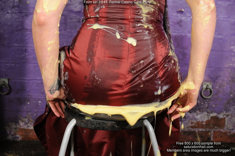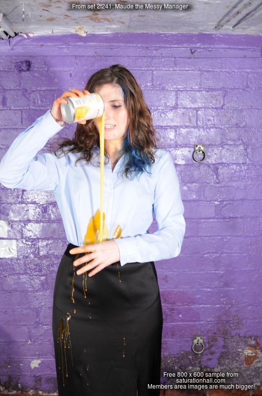Next, how will that beautiful long satin finish penil skirt handle the mess? Several cans of soup get poured in down the front, flowing inside the skirt and covering Maude's tights, visible through the skirt's long slit. Custard follows, just to really ramp up the test.