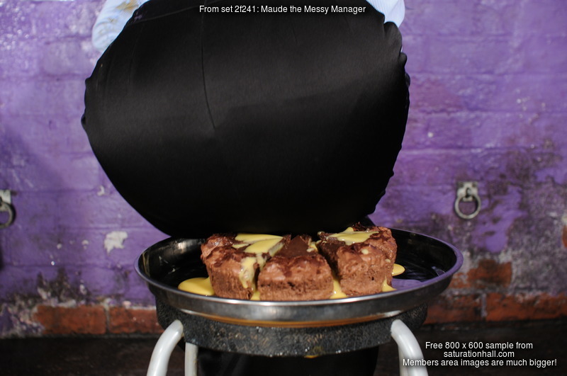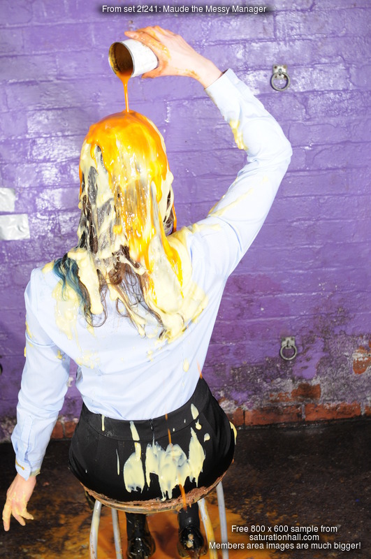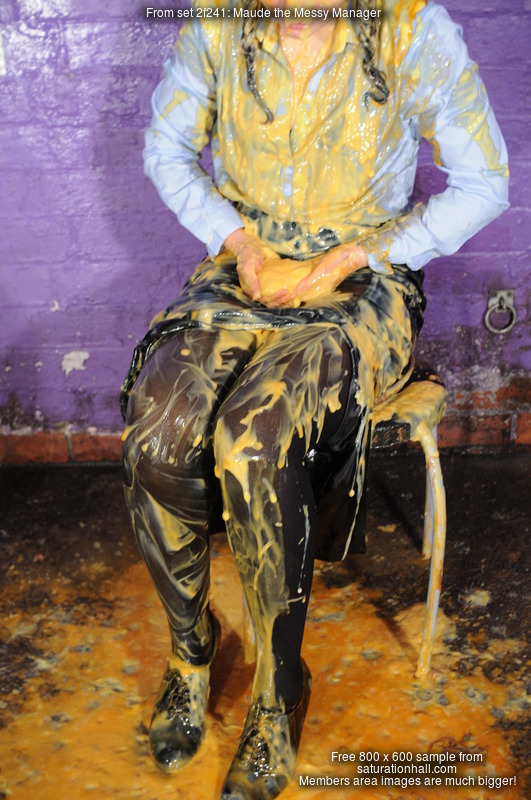 And from there, Maude does a very thorough and detailed mess test on her entire outfit. She treats the still-clean back of her skirt to a spectacular cake-sitting, she gives herself a very thorough messy shampoo, with the drips flooding off her head and flowing down over her blouse, she does some blouse filling both via the neckline and pouring mess into her sleeves, and by the end of the test she had reduced her outfit and herself to a wet and slippery mess, from head to toes. She lifts the skirt to show the very messy state of her tights too.