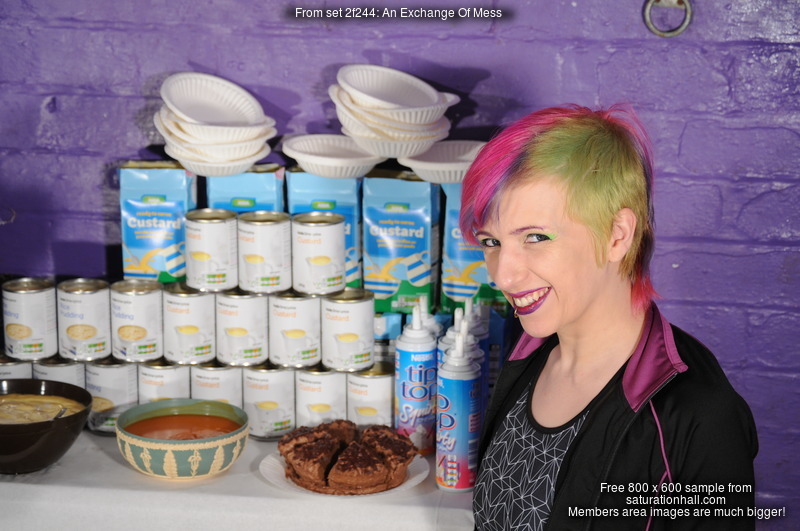 Technical: The videos for this scene have full original sound throughout. The video was tripod-shot for rock steady picture, the viewpoint was chosen so the girls' heads are still in shot when they stand up, and you can see every detail as they mess and pie each other. At the customer's request the acompanying photoset was shot using a telephoto lens to give a much closer up set of photos than we normally do, this proved to be an effective technique and we may well repeat it for our own future dungeon shoots.