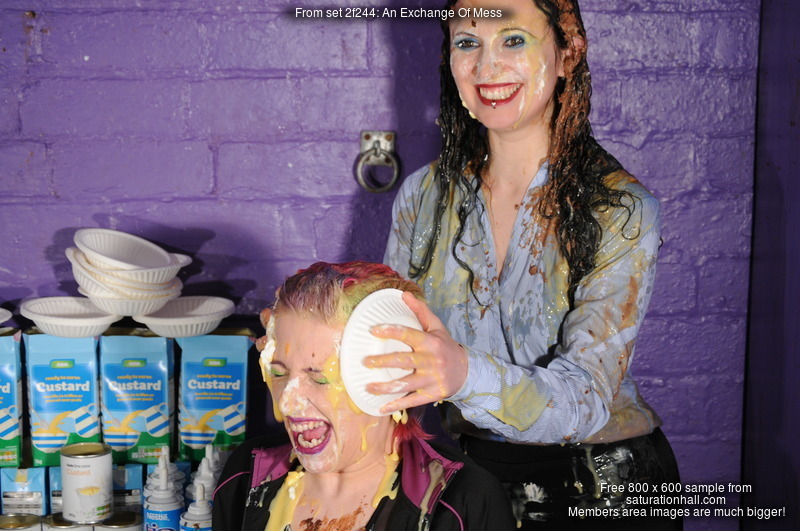By the end of the scene both girls are utterly covered and soaked in custard and squirty cream, from head to toe.