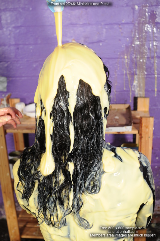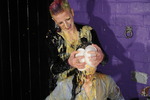 She also pies herself, dunks her head in a bucket of custard, and pours lots of it over herself, gradually getting more and more covered and soaked as the scene progresses.