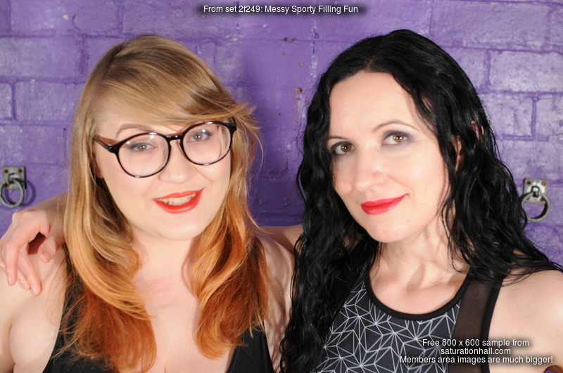 Penny Banks, dressed in a brand new black one-peice swimsuit and wellies, and Honeysuckle, wearing running tights and a running top, with no underwear, and wellies, spend a merry afternoon in the dungeon filling each other's clothes with porridge!