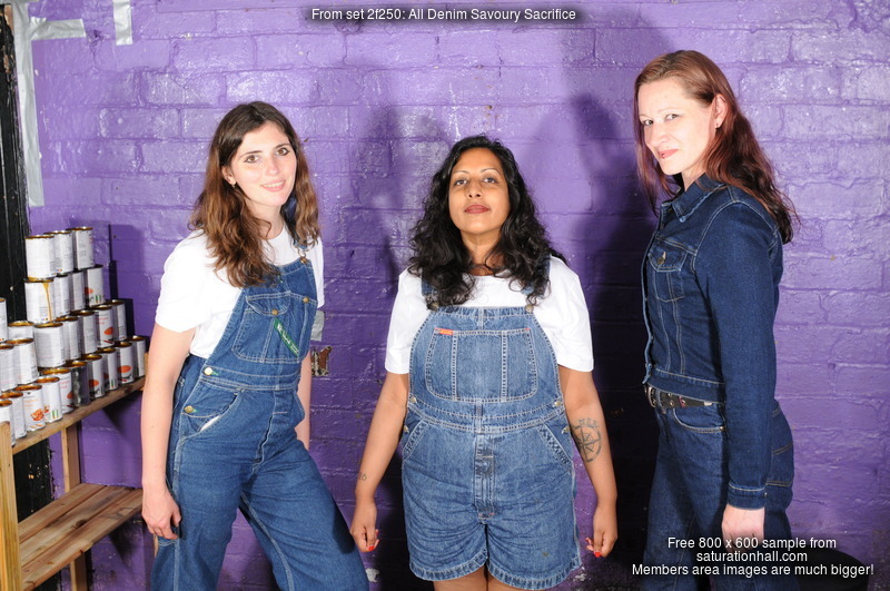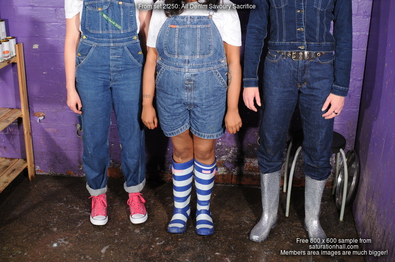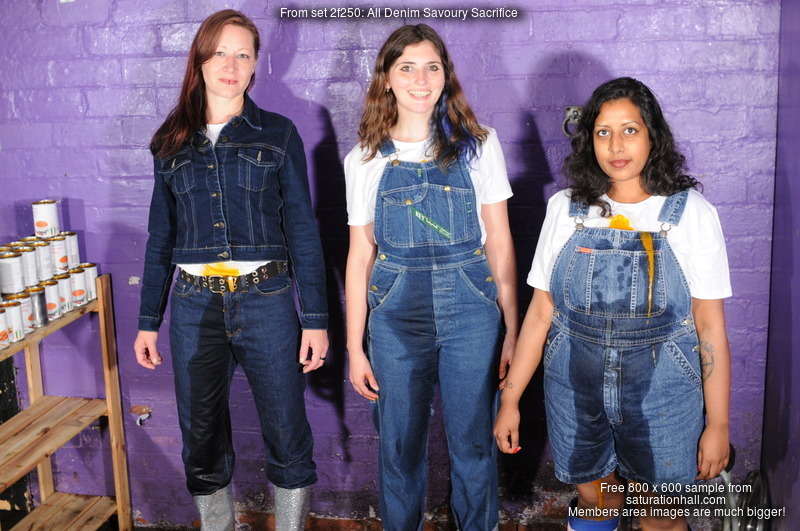 Maude wears long denim dungarees over a white t-shirt, and Converse boots, Teena is in denim shortalls over a white t-shirt, and blue and white stripey wellies, while Lucia is dressed in high waist dark denim blue jeans, white t-shirt, dark denim jacket, and sparkly wellies. And all three have agreed to submit to the ancient 'Savoury Sacrifice', where one of their number will get a bit messy, and then she gets to select who is next, until all the supplies are used and all three have been reduced to wet and sloppy savoury ruin.