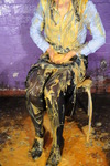 Before the clothes filling starts They also fill each other's wellies, and after the mess is poured in they pulls one now messy bare foot out of the welles and have even more porridge poured over their feet before sliding them back down into the mess-filled darkness of their boots.
