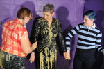Using paper bowls variously filled with custard, squirty cream, and occasionally even rice pudding, they repeately splat each other in the face, over their hair, and pie sandwiches. Honeysuckle also has slices of gateaux mashed into her lovely long black hair, and as well as many pies, they also have two full buckets of transparent clear gunge, some of which gets used in pieings and the rest of which they pour over each other.