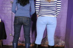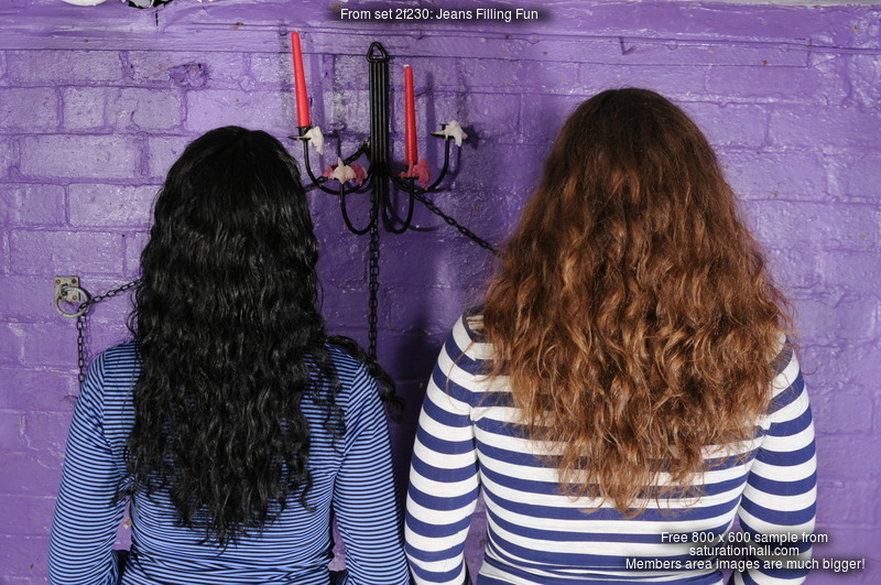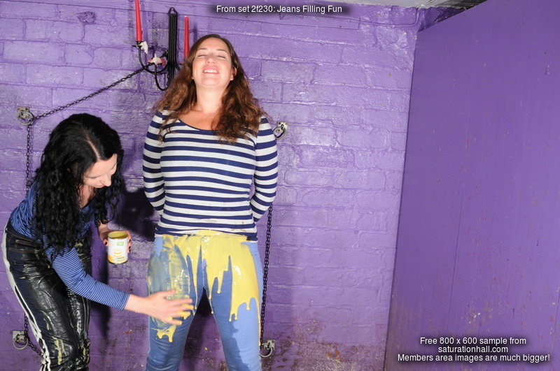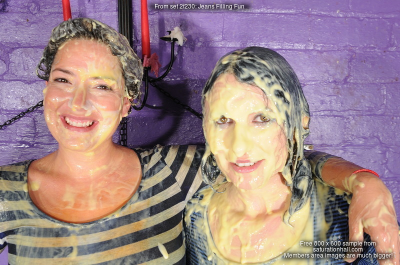 Lots of jeans filling ensues, both girls trousers getting very thoroughly filled, front and back, with mixed mess including cream, custard, and tomato soup for extra wettness. Once their jeans are well filled and coated, their tops get the same treatment, and needless to say there's full facial coverage and messy shampooing for both of them too.