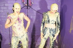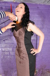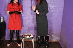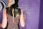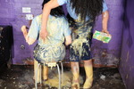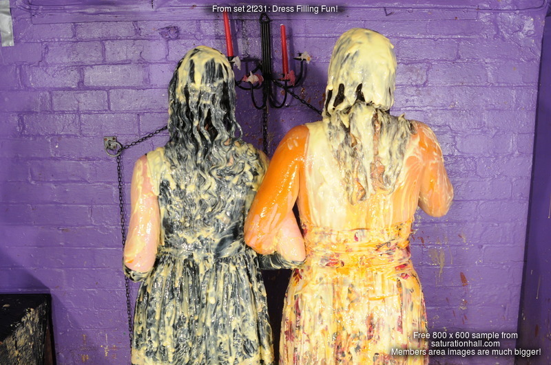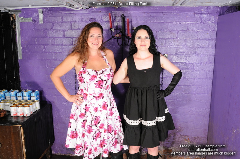 Maria, in a beautiful, brand new, white and pink 50s-style rockabilly dress, and Honeysuckle, in a very Gothic black and white dress, play scissors-paper-stone, with the winner getting to fill the loser's dress with mixed mess on each round. They have custard and soup to play with, and gradually reduce each other to messy ruin as the turns progress.