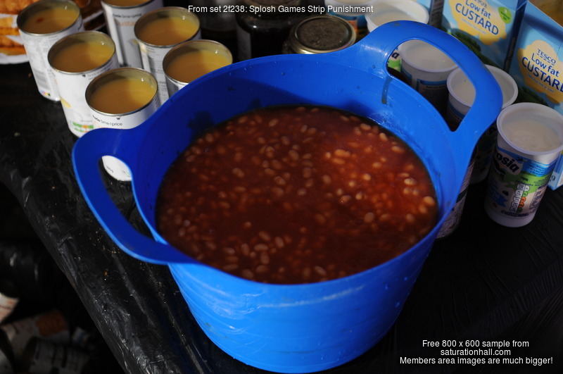 Honeysuckle must remain sitting, boots in the tub, and accept whatever Friday decides to do to her, but at the end of each turn Honeysuckle gets to instruct Friday to mess herself up a little, and Friday has to do as she's told, so while Honeysuckle suffers a spectacular barrage of beans, cream, custard, squirty cream, and a couple of custard flan pies, Friday soon has custard poured inside her excersise pants front and back, cream inside and then syrup all over the outside of her bra top, and custard down her back.