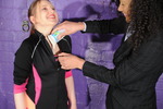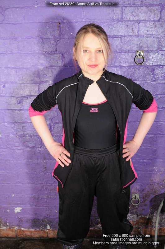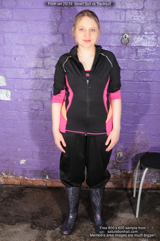 Meanwhile Friday wears black tracksuit trousers over a Slazenger swimsuit, with a black and pink running jacket. This being Saturation Hall both girls wear sparkly wellies to finish off their outfits, and hopefully contain any gunge that runs down inside their trousers so no-one loses the challenge too quickly.Each girl can chose where each pot of Dream is poured in or on her outfit, so needless to say there's lots of clothes filling as they try and get as much as they can inside their clothes without any dripping off. Friday has mess poured into her blouse, down her trousers front and back, and into her suit jacket pockets, including the ones inside the jacket in the lining. Felicity has the cream poured inside her swimsuit, down her trousers, and into the pockets of her running jacket.