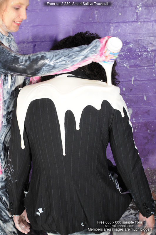 Needless to say both girls totally destroy each other with mess, including full hair coverage, mess shampooing, and finally face pours too. They completely slather each other in custard and cream till there's not a dry stitch on either of them, and finally pose, utterly drenched in mess, and very happy with how the uniforms perform in the mess.