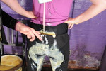 So now the time has come for Honeysuckle to pay for her misdeed. She's in the dungeon, dressed in exactly the same outfit she wore that night, black skirt and blouse over black underwear, with leather knee boots on. And he's sitting on a chair with her feet in an empty tub, and about to get totally deluged with lashings of savoury mess by Friday.