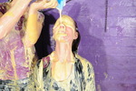 Honeysuckle is made to sit in a tray of mess, then her shoes get the treatment, one drenched in soup, the other in custard, various messes are poured down inside the front of Honeysuckle's dress, where we can see them flow under the mesh upper part and then soak through the main part of the dress from inside, she has soup and cream thrown over herself, and she gets a total messy shampoo and face pour too. Through all of this Maria, dressed casually in jeans and a stripey top, remains completely clean and dry.