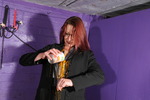 From here she gradually covers herself in more and more mess, pouring a halloween bucket of milk over her long socks, then her skirt, soaking it in white, then she adds rasberry syrup, covering both arms in "bleeding" stickyness. Milk, squirty cream, and syrup are mixed in the halloween bucket and the result smeared over her face. She removes her pointy witches hat, fills it with milk, and plonks it back on her head, litres of milk pouring over her head and down her shirt.