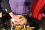 Next, she fills a silver tray with custard, and then carefully sits down in it, coating the seat of the trousers and dipping the edge of the tunic in thick yellow fluid.